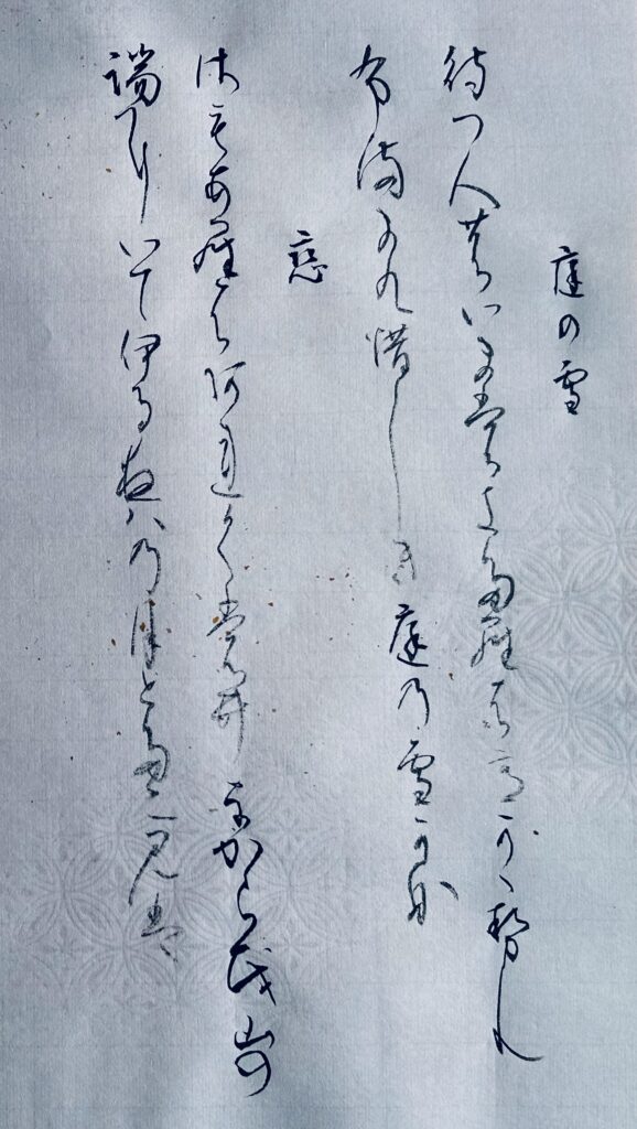 釈文:「待つ人の いまも来たらば いかがせむ 踏ままく惜しき 庭の雪かな」
