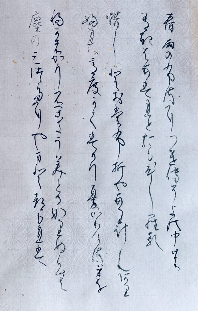 釈文:「春雨のふるにつけてぞ 世の中の 憂きはあはれと おもひしらるる」