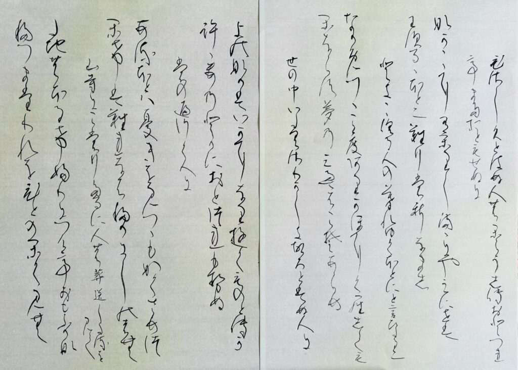 釈文:「世の中いたくさわがしきころ、とはぬ人に『世の中はいかになりゆく ものとてか こころのどかに おとづれもせぬ』」